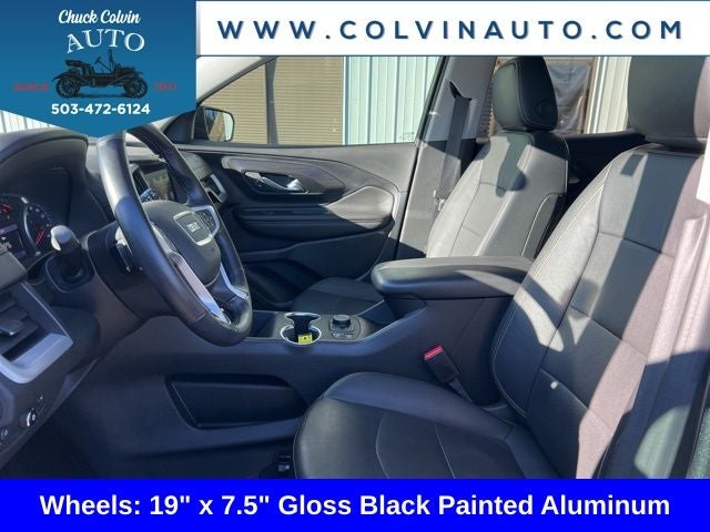 • Starred Features: 6-Way Power Front Passenger Seat, Universal Home Remote, Hands-Free Rear Power Programmable Liftgate, Black Mirror Caps, Darkened Front Grille, Heated Steering Wheel, Front Passenger 2-Way Power Lumbar, Black Roof Side Rails, Black GMC Center Caps with Black GMC Lettering, 19 Gloss Black Painted Aluminum Wheels