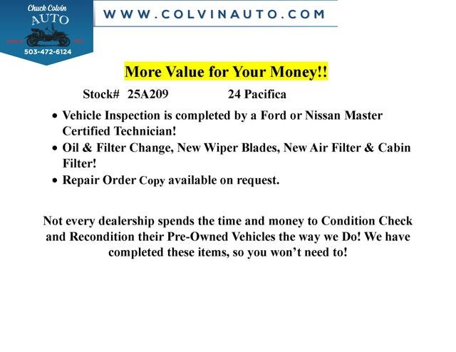 Step inside and be captivated by the thoughtful design and premium amenities that set this Pacifica apart. The Caprice Leatherette Bucket Seats offer exceptional comfort and support, while the 10.1 Touchscreen Display with Apple CarPlay and Android Auto integration keeps you connected and entertained on the go. Dual-zone automatic climate control, a Heated Steering Wheel, and a Power Liftgate add to the Pacifica's exceptional convenience and versatility.